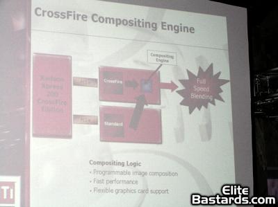 ATI talk about the compositing engine featured on the master card of a CrossFire setup, making note of their ability to blend images from two GPUs at full speed - A knock against NVIDIA's SLI anti-aliasing capabilities perhaps?