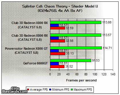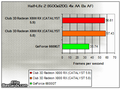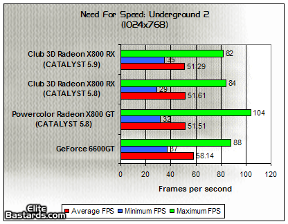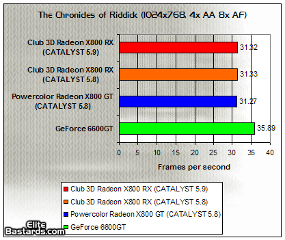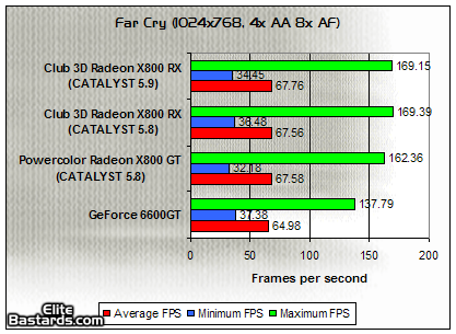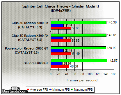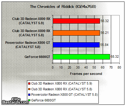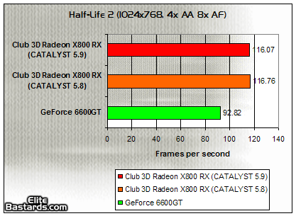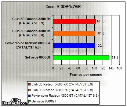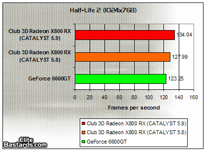 Using CATALYST 5.9 at 1024x768, the X800RX beats out the 6600GT by just over ten frames per second, as well as showing a bit of a boost over the previous CATALYST driver release.