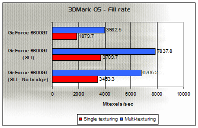 Using 3DMark05's fillrate test, we begin to see the inefficiencies of using an SLI setup minus the inter-GPU connector. Single-texturing fillrate remains comparable, but there is a deficit of 1000 MTexels/sec in multi-texturing performance when the bridge connector is not used.