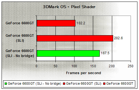 This fillrate deficit appears to carry over to the specific Pixel Shader test within the benchmark. Two 6600GTs without the bridge connector unsurprisingly beats out a single board, but trails 6600GTs in a 'true' SLI configuration by around 35 frames per second.