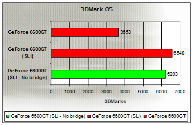 Over the course of the three standard tests which make up a final 3DMark05 score, performance is close between the SLI-enabled GeForce 6600GTs, regardless of whether or not the bridge connector is used - Indeed, removing the bridge only shows a drop of a few hundred points, and still leaves it well ahead of a single board. So far, so good for NVIDIA's theory.