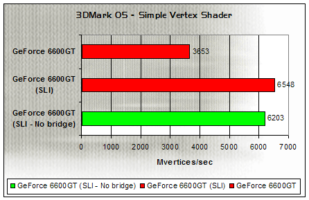 Without the inter-GPU connector, Vertex Shading also appears to be somewhat slower, although not be as huge a margin as we saw with the pixel shading test. Performance in both Vertex Shader tests is still way above a single 6600GT.