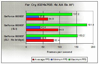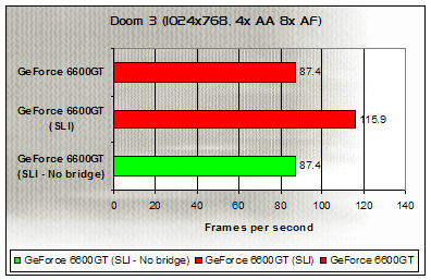 At 1024x768 with AA and AF, performance between a single 6600GT and a non-bridged SLI setup is, literally, identical - Showing no gains while a true SLI rig performs almost 30 frames per second better.
