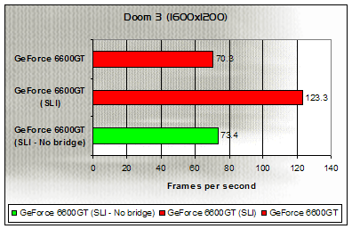 At 1600x1200, the effect of not using the bridge connector is far more severe, with this configuration holding only a small advantage (under 10 FPS) over a single 6600GT, whereas a true SLI configuration pulls opens up over a 20 frame per second gap over a non-bridged SLI setup. This equates to around a 37% performance drop.