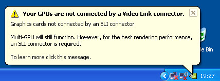 To set up an SLI system minus the inter-GPU connector is simplicity itself - Simply install the ForceWare 77.72 drivers, and install the two video cards as you would in a standard SLI setup, except sans the connector. NVIDIA's drivers will detect and allow you to activate SLI mode as per normal, but upon rebooting to switch on SLI mode you will be greeted by the following screen (Clicking the message in question takes you to NVIDIA's web site).