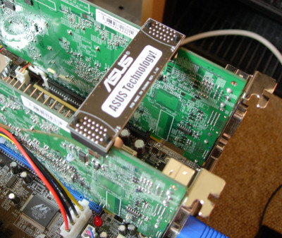 The same ability of NVIDIA's drivers also showed the difference in efficiency between running with and without the bridge connector beyond pure performance numbers. Click on the thumbnail below to view two photos, the first taken while running in 'true' SLI mode, the second minus the bridge connector.